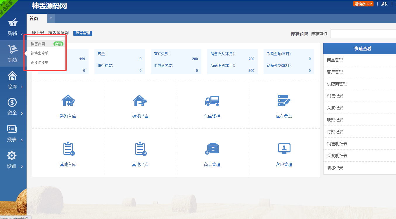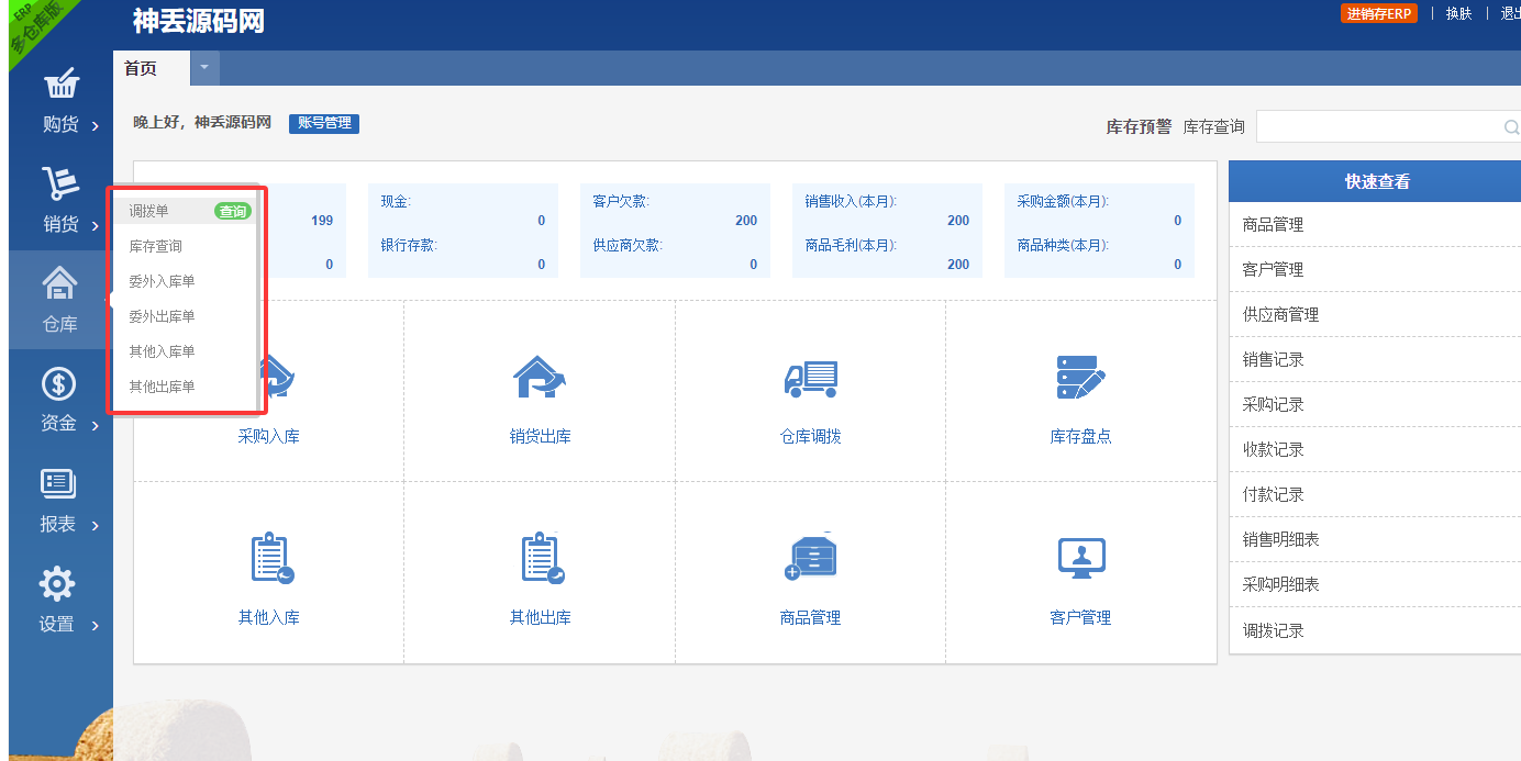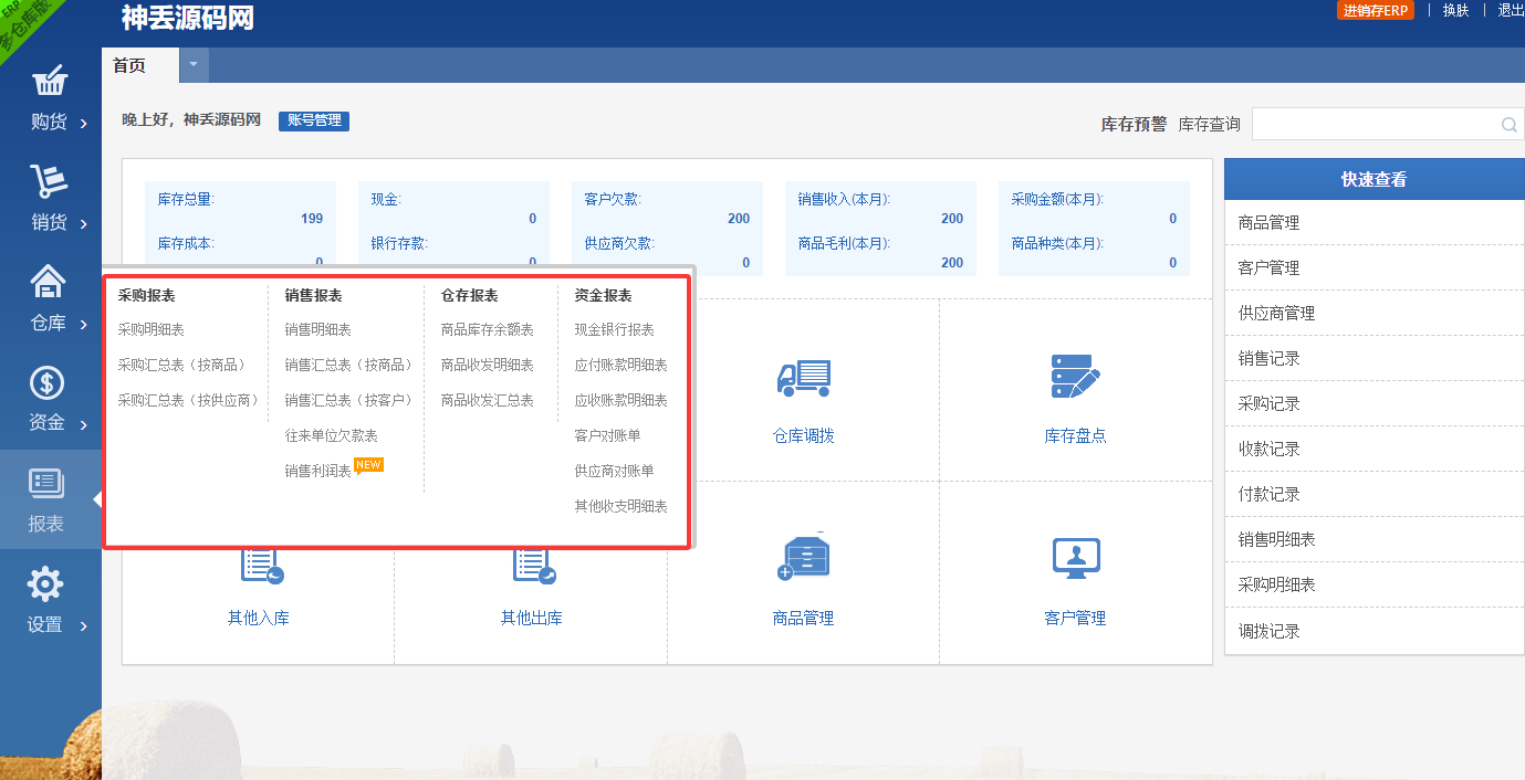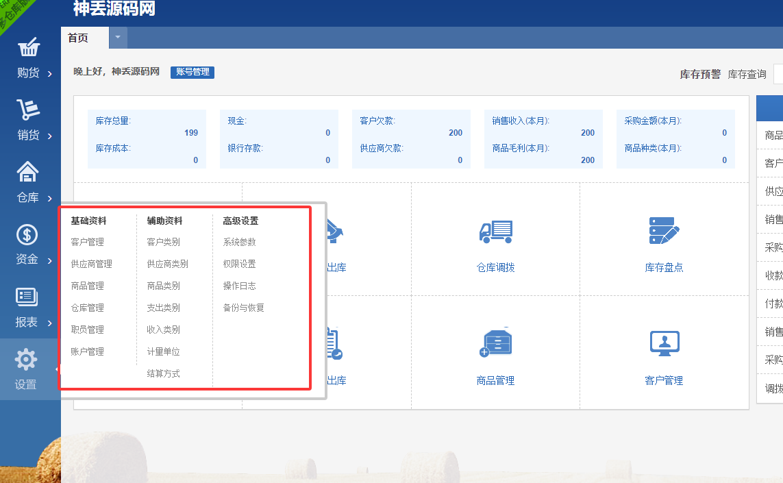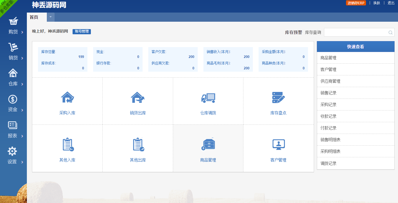 含购货,销货,仓库管理,商品管理,供应商管理,职员管理等非常多的功能。