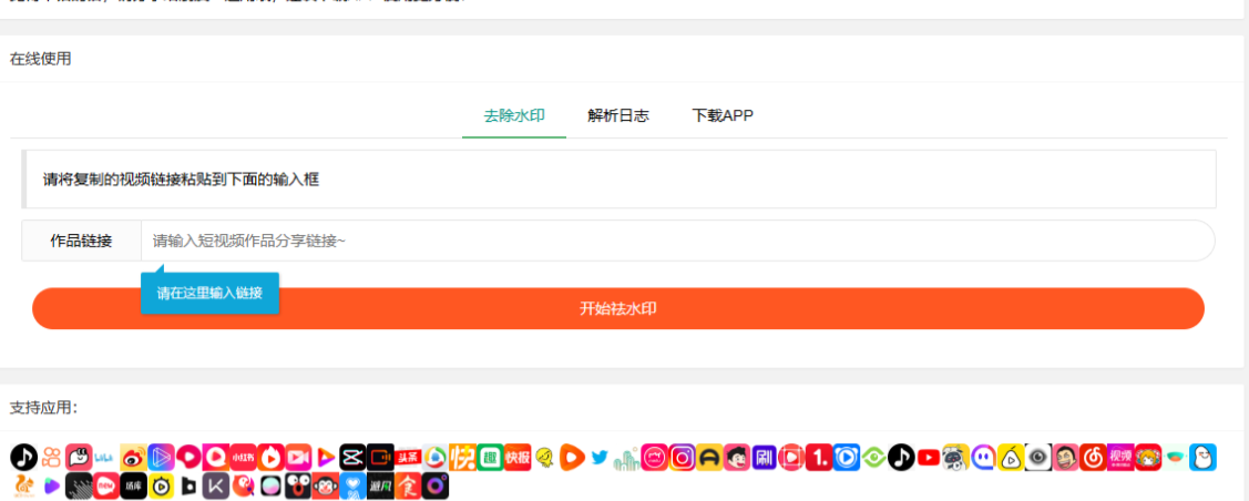 抖音块手小红书皮皮虾微视等几十种平台去水印网站PHP源码 下方是演示图,源码下载链接在底部 安装环境:PHP必须是7.2或7.3版本 无需配置其它啥,上传解压即可使用! 网站名称,站长QQ,等信息修改 请在includes/config.php